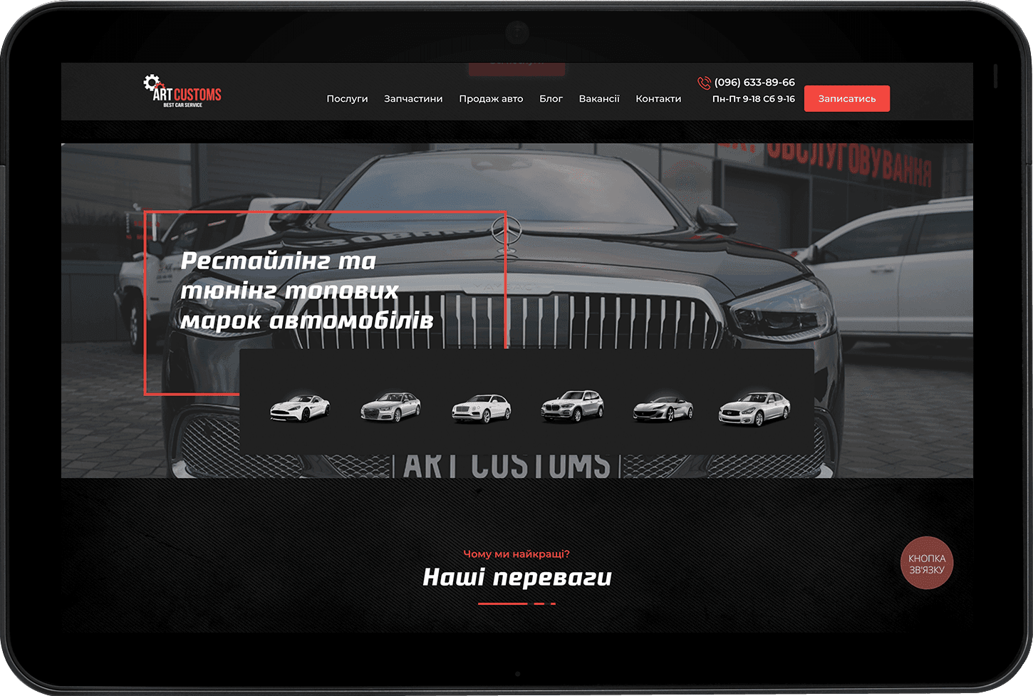 Заказчиком поставлена задача создать корпоративный сайт станции технического обслуживания ArtCustoms, отвечающий четким требованиям к дизайну и фирменному стилю. Каждый визуальный момент согласован и утвержден заказчиком. Одной из ключевых задач было внедрение на сайте каталога услуг, а также продажи авто и запчастей к ним.